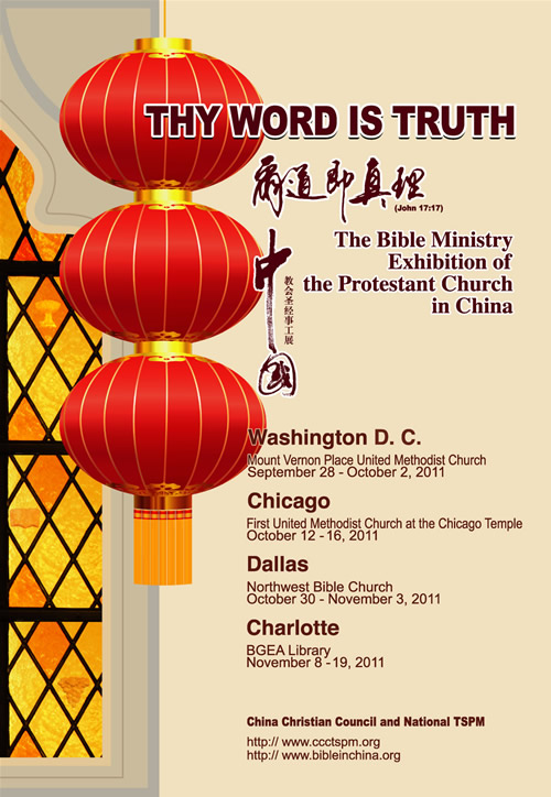 2011年9月至11月,中国基督教两会将再次在美国举办主题为“尔道即真理”的中国教会圣经事工展。展览将全景式地展现中文圣经翻译、出版的历史,特别是1980年代中国教会恢复活动以来圣经的印刷、出版和发行事工。展览也将同时展示中国基督徒热爱圣经的信仰和生活见证,从而见证神对中国教会的祝福与恩典。同时,来自中国的基督徒艺术家和少数民族基督徒还将进行各种演出,让人感受基督教与中国文化的融会,以及对基督教处境化的诠释。