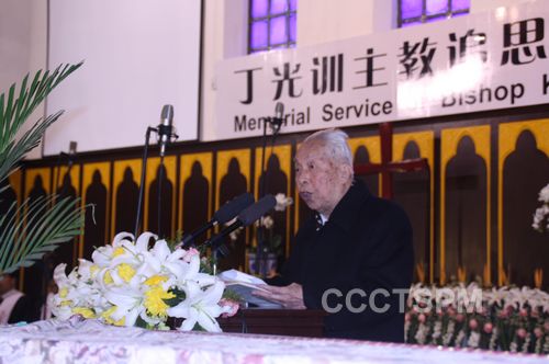 1时30分,序乐响起,追思礼拜正式开始。礼拜由中国基督教协会会长高峰牧师主持,原金陵协和神学院教授赵誌恩牧师祷告,南京市基督教三自爱国运动委员会主席、莫愁路堂主任牧师李兰成牧师宣读了旧约《以赛亚书》25:6-9,江苏省基督教协会会长张克运牧师宣读了新约《约翰福音》11:23-27,美国基督会亚洲区负责人朱晓陵牧师宣读了《启示录》14:13。中国基督教全国两会咨询委员会副主任邓福村牧师以“爱是永不止息”为题证道。邓牧师证道中说:丁主教的一生是奉献的一生,是将身体当作活祭的奉献,也是他的母亲(一位享年101岁的老姊妹)用祷告托住的奉献。他在中国教会60余年的侍奉中,积极参与了金陵协和神学院的筹建,提出了“从三自转入三好”,推动了中国教会的神学思想建设。丁主教非常重视读圣经,他还专门写了《怎样读圣经》一书来帮助弟兄姊妹读好圣经,并提出“圣经使我们联合”。丁主教的一生是爱国爱教的一生,为建设一个爱国爱教、荣神益人、健康发展的中国教会,他已鞠躬尽瘁,所留下的美好脚踪将激励我们奋力前进。