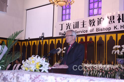 追思礼拜中,原金陵协和神学院副院长陈泽民牧师、英国圣公会坎特伯雷大主教的特派代表大卫•厄克特主教和香港圣公会荣休大主教邝广杰分别致词。陈泽民牧师回忆了与丁主教相识几十年来对他的认识。大卫•厄克特回忆了2006年与坎特伯雷大主教威廉姆斯来访时到丁主教家拜访的情景,对丁光训主教带领中国教会所走的路深表赞赏,并提到英国很多主教都希望能有像丁光训主教一样美好的侍奉。香港圣公会邝广杰荣休大主教讲述了上世纪80年代他首次与丁光训主教见面时的情景,谈到丁光训主教富有魅力、充满智慧的谈吐以及对他这样一个后辈的关心、都让他深受感动,也为丁主教在上帝带领下在中国教会所做的事工而感恩。
