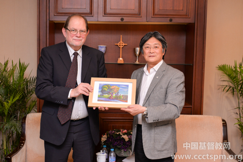 会谈结束后,宾主双方交换礼物并合影留念。中国基督教三自爱国运动委员会副秘书长顾梦飞同工、中国基督教协会副总干事林曼红牧师和海外联络部的同工们参与了此次会谈接待。